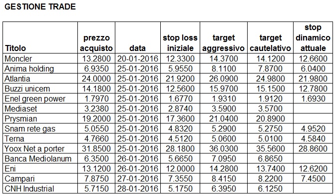 Data la situazione attuale sui mercati, e visto che diversi titoli questa mattina avevano messo a segno nuovi massimi di breve, che portavano a ritoccare verso l'alto gli stop dinamici, mi pare opportuno segnalare anticipatamente questi nuovi livelli di stop dinamico.