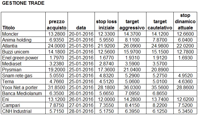 Vediamo il portafoglio con l'indicazione dei livelli attuali di stop dinamico: