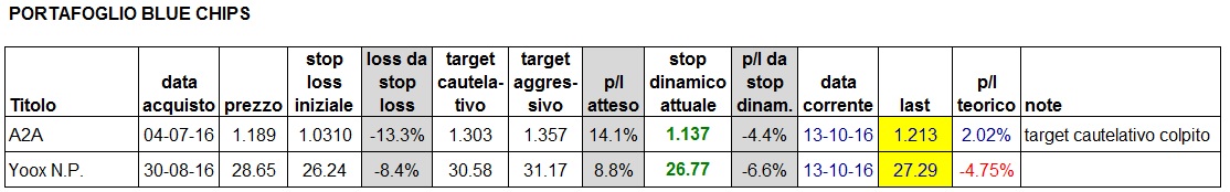 A2A ha fatto un bel rimbalzo con volumi in aumento oggi. Speriamo sia il preludio a qualcosa di positivo, anche se nel finale ha perso slancio. Yoox sempre laterale, con pochi volumi. Portafoglio aggiornato alla chiusura di oggi:
