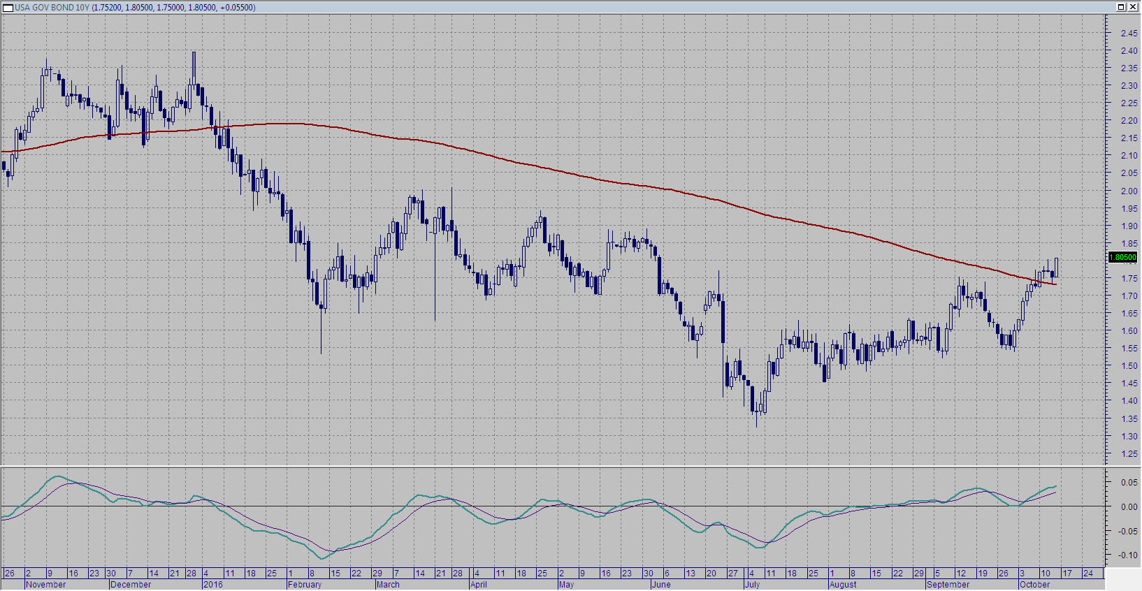 Infatti, il benchmark governativo decennale USA ha superato la media a 200 giorni (grafico dei rendimenti), portandosi in area 1,80% cioè quasi 50 bps in più rispetto al minimo di questa estate a 1,32%.
