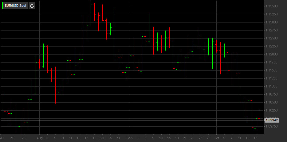 A corollario della salita dei rendimenti troviamo il cambio EUR/USD (cambio spot) che ha bucato al ribasso area 1,10 rivalutandosi del 2,7% circa contro Euro dal massimo in area 1,13 di agosto.