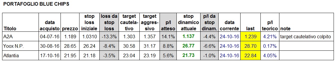 Storna A2A dopo essersi comportata bene per diverse sedute. la barra non è proprio bella, ma per ora non preoccupa particolarmente: siamo sempre in trading range di medio. Bene Atlantia, che segna un nuovo massimo di breve e ci permette di spostare lo stop verso l'alto: ora si attesta a 21.73. Benino anche Yoox, che si avvicina ai massimi della lunga fase laterale. Sarà la volta buona?