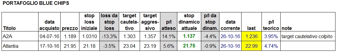 il segnale di Yoox di ieri purtroppo si è confermato anche oggi e lo stop loss è stato colpito. Sempre stabile A2A, mentre Atlantia ha ritoccato leggermente verso l'alto il massimo di periodo, portandoci ad alzare di conseguenza leggermente lo stop dinamico, che ora si assesta a 21.75.