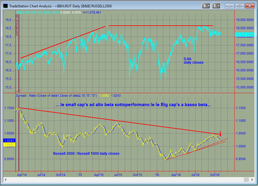 Un altra indicazione che gli investitori dal 22 settembre stanno tornando verso una maggior cautela, viene dall'analisi del ratio tra l'indice Russell 2000 e il Russell 1000. Sono due sottoinsiemi del Russell 3000. Nel Russell 1000 confluiscono le 1000 aziende a più ampia capitalizzazione che fanno oltre il 90% dell'intera capitalizzazione del Russell 3000: l'azienda più piccola capitalizza 1,8 miliardi di $. Il Russell 2000 contiene le 2000 aziende a minor capitalizzazione (small cup) del Russell 3000 e rappresenta una capitalizzazione del 10% scarso del Russell 3000. In mercati toro "sani" i fondi di investimento inseriscono volentieri e sovrappesano questi "titolini" dotati di un Beta più alto . Il grafico sopra mostra invece come il rapporto tra i due indici sia sfavorevole alle "higher-beta"; dalla primavera del 2014 ad ora il ratio evidenzia un chiaro trend negativo con due onde in contro-trend (la prima da ottobre 2014 a giungo 2015 e la seconda da gennaio a settembre di quest'anno). Le due trendline che hanno sorretto il rialzo da gennaio a settembre sono entrambe rotte al ribasso. Generalmente, quando le small cap sottoperformano parecchio , il mercato sta avanzando sul ghiaccio sottile. Così, uno scenario più probabile è, per il mercato azionario, di rompere al ribasso in combinazione con un uptick nel VIX e un calo più profondo nel Daily Sentiment Index dell'S&P , con una seconda ondata di ribasso, e un accresciuto senso di "paura" verso le azioni. Dopodiché le condizioni sarebbero forse più adatte per l'inizio di un rally di terza ondata che porti a nuovi massimi. Il problema sarà capire sugli indici principali quanto inciderà e dove porterà un rally ribassista. Chiudiamo con il Nasdaq100 che ha ancora bisogno di un ultima onda al rialzo sopra 4.900 per terminare l'ending diagonale e l'onda 5.