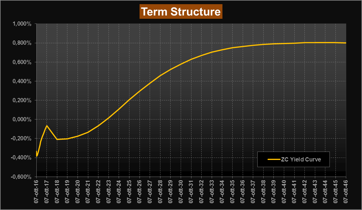 Passando all’esame delle nostre consuete curve, sulla ZC Yield Curve osserviamo un restringimento dei rendimenti di circa di 10 bps sul tratto a lunga. Infatti nell’ultimo aggiornamento si viaggiava in area 0,91% mentre ora siamo tornati a 0,80%. La curva ha tuttavia mantenuto sul tratto medio-breve una conformazione lievemente più ripida rispetto al recente passato.