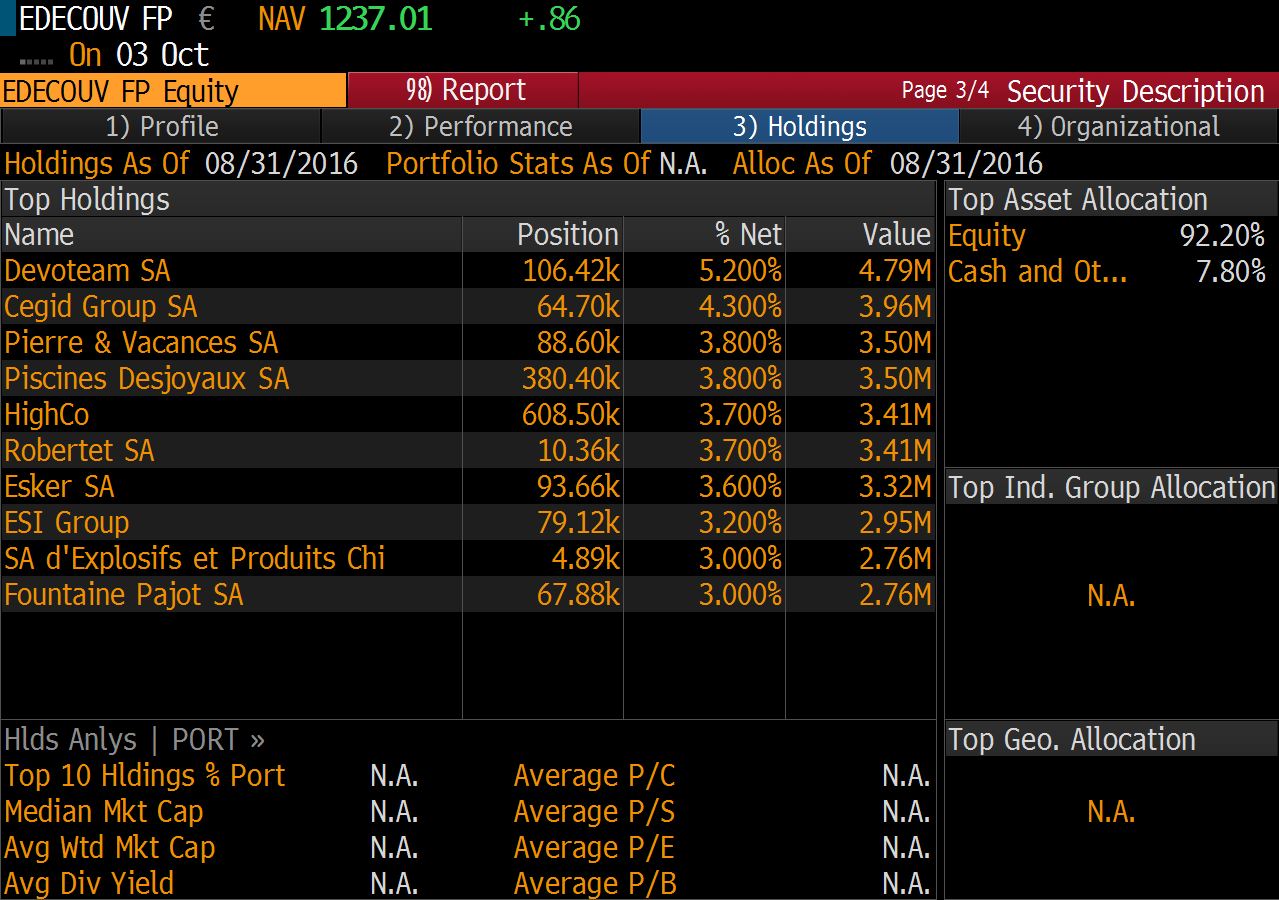 DECOUVERTES – D (ISIN: FR0007430806) è un fondo aperto registrato in Francia con asset per 105M di euro. L’obbiettivo del fondo è sovraperformare l’indice francese investendo tra il 75-100% in titoli francesi, prevalentemente bassa capitalizzazione. Decouvertes ha segnato un 23,43% annualizzato negli ultimi 3 anni (top 99 percentile assoluto) e un 14,60% YTD.