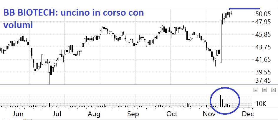 BB BIOTECH: sempre in accumulazione, se la guardate sul mensile bella davvero; oggi i volumi languono, ho paura a mettere fuori un buy stop perché potrebbero prendercelo, da qui al referendum non vedremo molta volatilità sui mercati.