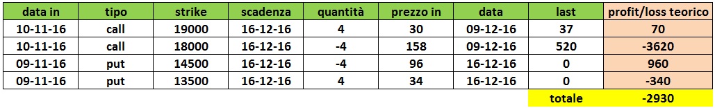 si è chiuso il mese di dicembre e abbiamo incassato una perdita di 2930 euro (vedete portafoglio qui sotto) in funzione del prezzo indicato di 520 punti per la ricopertura delle call 18000 e di un prezzo di 37 punti che batteva denaro al momento in cui è stato dato il segnale di rivendita delle call 19000.