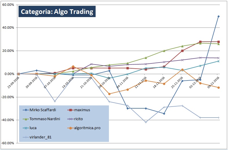Lotta fino all’ultimo sangue nella categoria Algo Trading (figura 1), dove nelle ultime settimane stavamo assistendo ad un appassionante duello tra Tommaso Nardini (intervistato alcune settimane fa, trovate cliccando qui il video) e Maximus, che si contendevano il primo posto con performance molto vicine tra loro: alla fine ci siamo tutti risvegliati di botto con la performance di Mirko Scaffardi, alias jr1976, che nell’ultima settimana ha messo a segno un profitto tale da farlo balzare di prepotenza al comando. Suo il titolo di Top Trader 2016 per la categoria Algo Trading, con una performance del 50%. A breve pubblicheremo una intervista video anche a questo campione.
