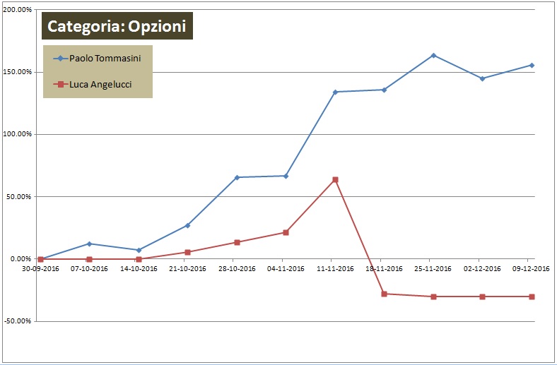 Gara avvincente anche nella categoria Opzioni (figura 4), dove abbiamo assistito per diverse settimane ad una gara a due, per poi osservare uno dei due protagonisti cadere sotto i colpi di un mercato davvero molto difficile, lasciando così la strada spianata verso la vittoria ad una nostra “vecchia” conoscenza, già protagonista della Traders Cup 2015: Paolo Tommasini. Intervisteremo Paolo nei prossimi giorni e pubblicheremo il video sempre sul canale YouTube di Traders’ Magazine.