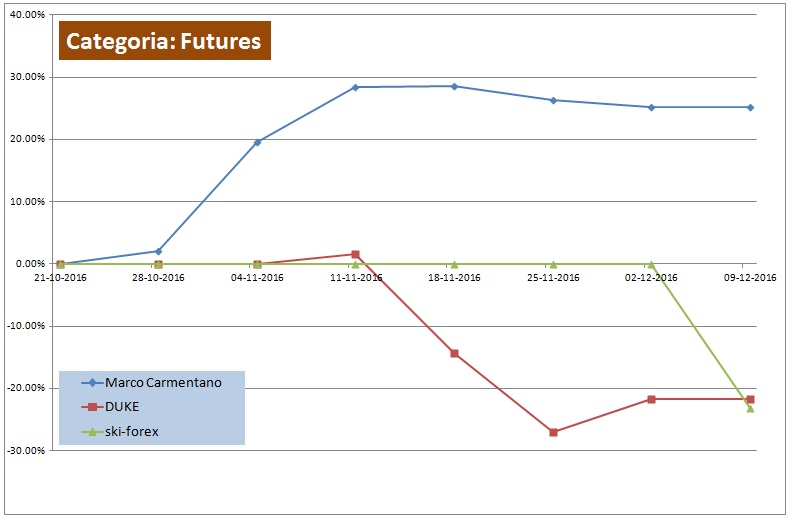 Un elemento di sorpresa di questa edizione della Traders Cup è stato il quasi totale disinteresse per la categoria Futures, segno, riteniamo, di un cambiamento importante nella storia del trading on line: i CFD sembrano essere ormai di gran lunga preferiti dai trader, che in essi avranno certamente trovato, rispetto ai futures, un veicolo per modulare meglio le dimensioni delle posizioni assunte. Soltanto tre concorrenti si sono avventurati nel campo dei derivati tradizionali, e soltanto uno ha terminato la competizione con un saldo positivo: si tratta di Marco Carmentano, alias marcker92, che ha portato a casa un bel +25%. Avremo presto ai nostri microfoni anche questo trader.