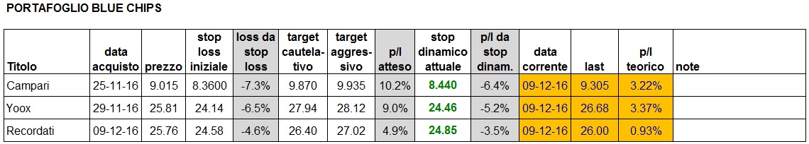 piccola correzione del mercato oggi, che però non ha toccato i titoli in portafoglio. Bene Campari che trova slancio e ci permette di alzare lo stop. Bene anche Yoox, anche se deve ancora superare il precedente massimo di periodo e quindi per ora non ci lascia difendere i profitti teorici.