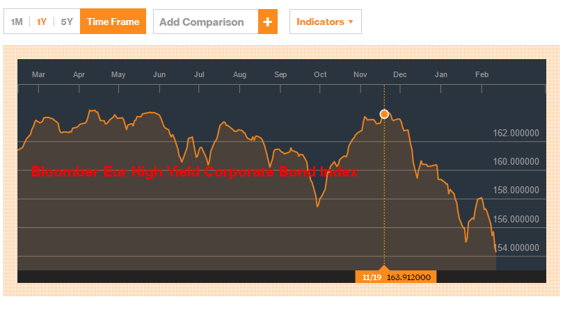 Il 20 gennaio, (evidenziato sul grafico) Zurich è crollato di oltre l'11% dopo aver annunciato una perdita trimestrale di 100 milioni di dollari nel suo settore più grande che è costituito dalle assicurazioni generali. Bloomberg sottolineò quel giorno che il disastro arrivava in un momento difficile per Zurich, ma in realtà dopo tanti anni di tassi prossimi allo zero ed ora in negativo, la scomparsa di rendimenti anche sugli investimenti a lungo termine, finisce inevitabilmente per devastare i modelli attuariali assicurativi. Le innovazioni finanziarie poi sono state progettate per rimuovere il rischio e spalmare le potenziali perdite sui varie controparti e se togli/abbassi il rischio non serve più nemmeno l'assicurazione o serve comunque di meno. Entro 5-10 anni al massimo le automobili si guideranno da sole e saranno più sicure ed affidabili di un pirla ubriaco, drogato o arteriosclerotico al volante... già oggi i satellitari installati a bordo delle auto potendo localizzare immediatamente dove si trova il mezzo hanno permesso di ridurre sensibilmente i costi delle polizze furto... insomma tutto lascia prevedere la scomparsa dalle scene di acluni dei più grandi assicuratori oggi esistenti. Zurich oggi ha più di 60.000 dipendenti ed è presente in circa 170 paesi. E' probabile che nei prossimi anni la presenza globale della società andrà a ridursi a livelli impensabili solo fino a pochi anni fa. La fuga degli investitori da obbligazioni ad alto rendimento è un altro segnale importante che si manifesta in questi tempi.
