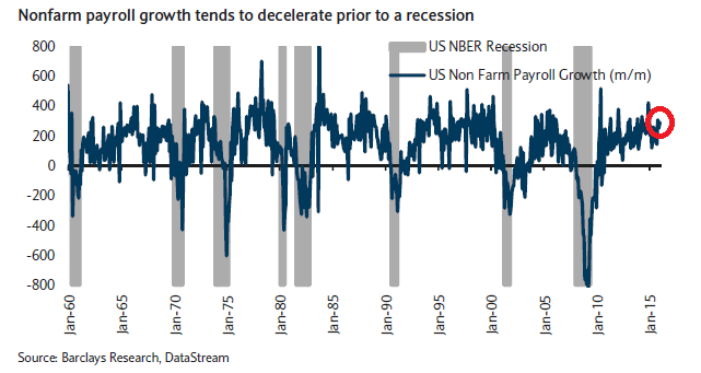 MACROECONOMIA: sono 3 gli indicatori macro che gli investitori istituzionali guardano e questi 3 indicatori sono quelli che più frequentemente citiamo nel nostro sito e che io seguo (gli altri francamente vogliono dire poco). Il primo è quello dei NON FARM PAYROL ovvero gli assunti mensili nei settori NON agricoli. Finché questo dato rimane positivo e tipicamente sopra i 200.000 in media l'economia USA continua a tirare. E possiamo vedere nel bel grafico che segue che ogni picco precedente prima della recessione ha sempre avuto un NON FARM PAYROL decrescente mentre ora è incredibilmente sui massimi (in grigio le aree temporale relative alle recessioni precedenti):