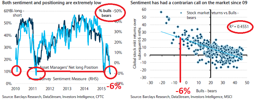 Faccio notare come nel grafico di destra qui sopra sia riportato una INTERESSANTISSIMA STATISTICA di cosa significhi avere un -6% sui bulls-bears ovvero il rendimento prossimo venturo sarà impressionante (in media ovviamente, stiamo sempre parlando di probabilità). Faccio ulteriormente notare (per gli esperti di statistica) che un R quadro dello 0,45 in finanza è una enormità dove già per solo lo 0,20 ti danno il premio Nobel (r quadro ci dice quanto sia "affidabile" la regressione che vedete nel quadrante di destra qui sotto ovvero la regressione è MOLTO affidabile per lo standard delle relazioni funzionali presenti sui mercati finanziari).