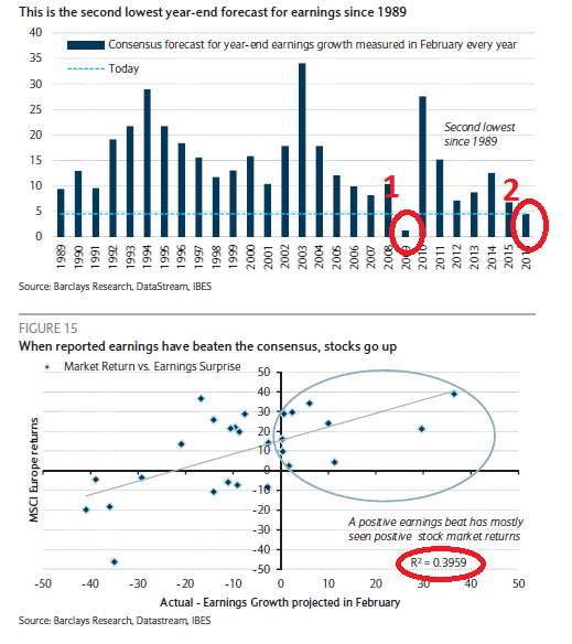 Quello che muove i mercati sono le "sorprese" degli utili che battono le attese. Ed è dal 1989 che le attese della crescita degli utili per la fine del 2016 non sono così basse, il +4,5% come dimostra il grafico che segue in cui si vede che le stime sono le seconde più basse dal 1989 ad oggi ma guardate cosa succede nel grafico sotto quando la crescita effettiva degli utili supera la crescita attesa: il mercato vola e in particolare il riferimento è ai casi nel cerchio sul grafico. Il succo del discorso è chiaro: se le attese per la crescita degli utili sono basse è facile che la realtà superi le attese. E quindi è facile che il mercato faccia boom (al rialzo, non al ribasso).