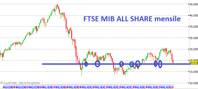 L'indice italiano ha rotto i minimi del triangolo quasi perfetto disegnato nelle settimane precedenti e si sta posando pericolosamente sul fondo dei fondi, ovvero su un supporto che è stato toccato almeno XXX volte dal novembre del 2008. Molti altri pennivendoli italiani come il sottoscritto sono passati dalla positività alla negatività in base al crollo dei prezzi. Di seguito il grafico che mostra come siamo a livello di indice italiano su un supporto importante, la cui rottura non può essere invocata fino ad una prova conclusiva, perché la trappola per Orsi è sempre in agguato:
