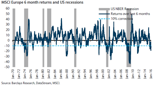 EARNINGS: Le azioni europe perdono il 10% nei 6 mesi scorsi. Delle 14 occasioni in cui le azioni sono declinate più del 10% 7 sono stata associate con una vera e propria recessione negli USA, con i mercati azionari che hanno fornito rendimenti opachi nei sei 6 mesi successi, ma nelle altre 7 volte i mercati hanno recuperato in maniera impetuosa,, postando rendimenti del 7%, del 10% e del 18% nei successivi 3, 6 e 12 mesi. Segue grafico (in grigio le aree temporale relative alle recessioni precedenti):