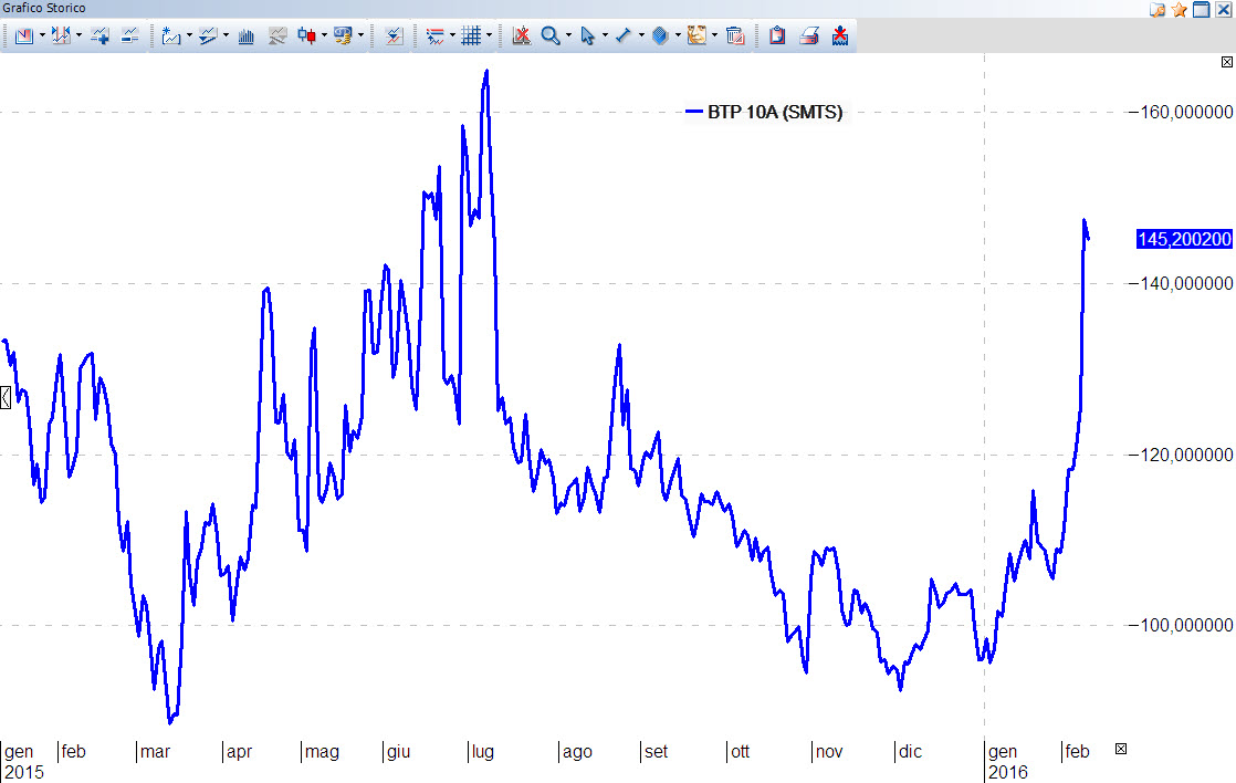Iniziamo a vedere l’impennata, notevole, del nostro spread BTP/BUND che passa da poco più di 105 bps di fine gennaio agli attuali 146 bps: una sberla del +38% in due settimane. Eppure, apparentemente, non pare che le vicende italiche vadano peggio di come son sempre andate…