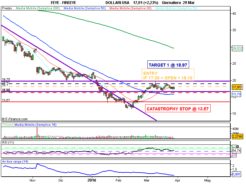 ENTRY : Se oggi 30 Marzo 2016 il titolo apre all’interno dell’ intervallo 17.20 – 18.10 imposta ordine condizionale per BUY 10% “capitale operativo di riferimento” a mercato con limite 18.10