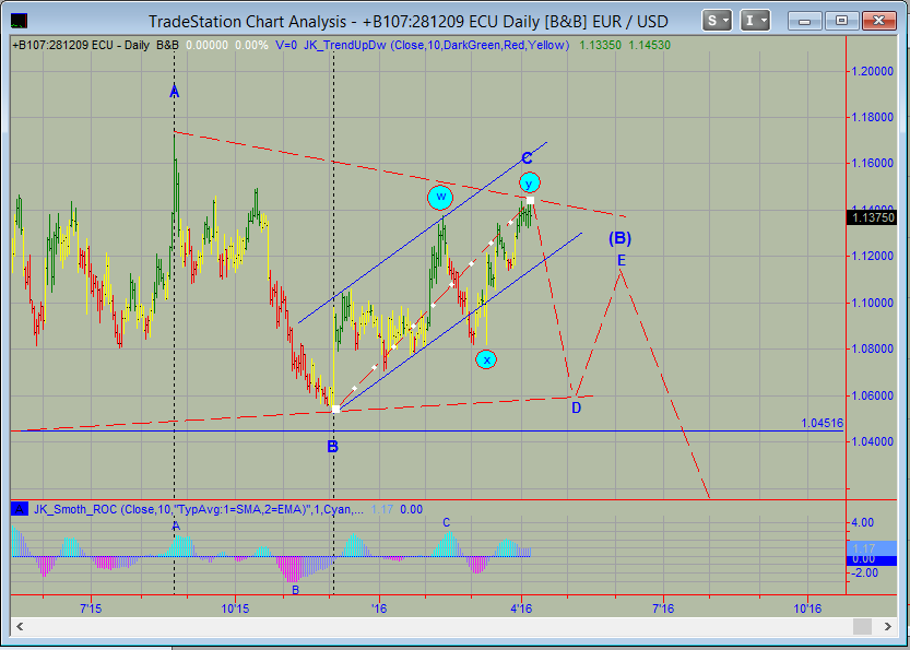 Nulla di nuovo nemmeno sul cross Euro-Dollaro. Anche in questo caso l'onda D dovrebbe iniziare molto presto e ripercorrere almeno due terzi dell'onda C. Il massimo di onda A a 1,1712 non deve essere superato pena l'invalidazione del nostro modello.