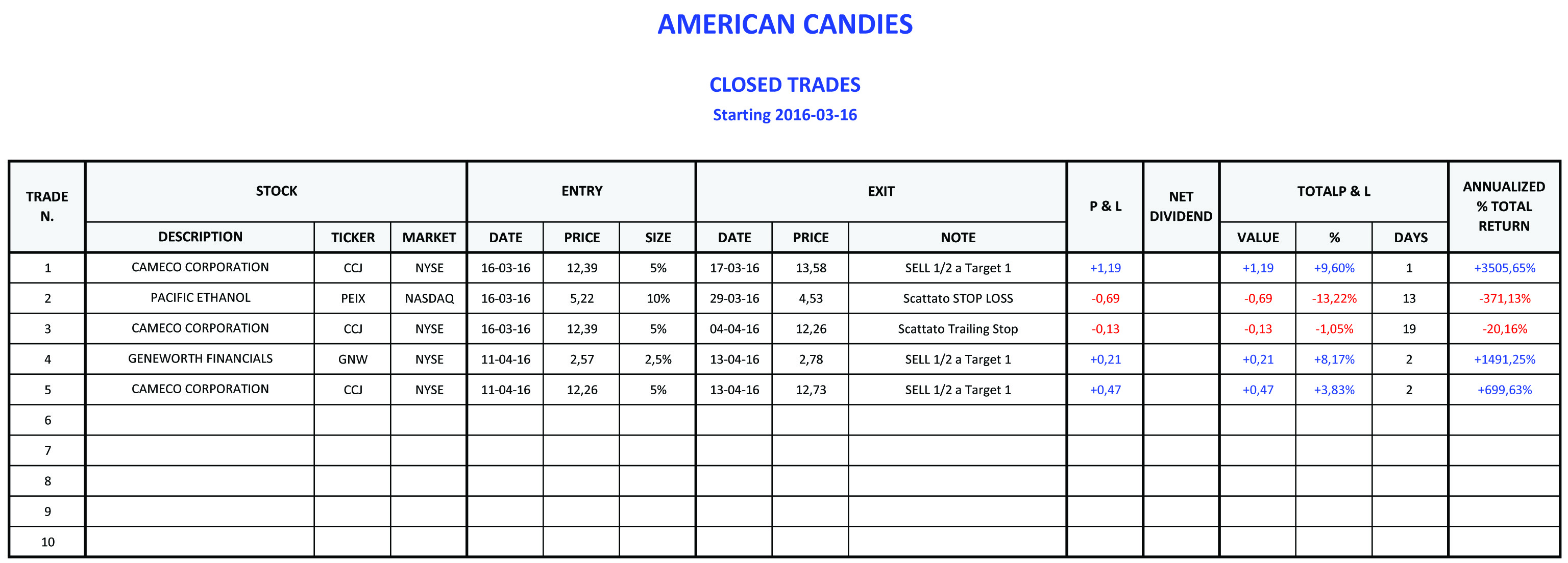 ieri è scattata la presa di profitto parziale sul primo target per Geneworth Financials con una performance del +8.17% e per Cameco Corporation con un risultato del +3.83%. Per le restanti parti dei singoli titoli, per il momento lasciamo invariati gli stop iniziali.