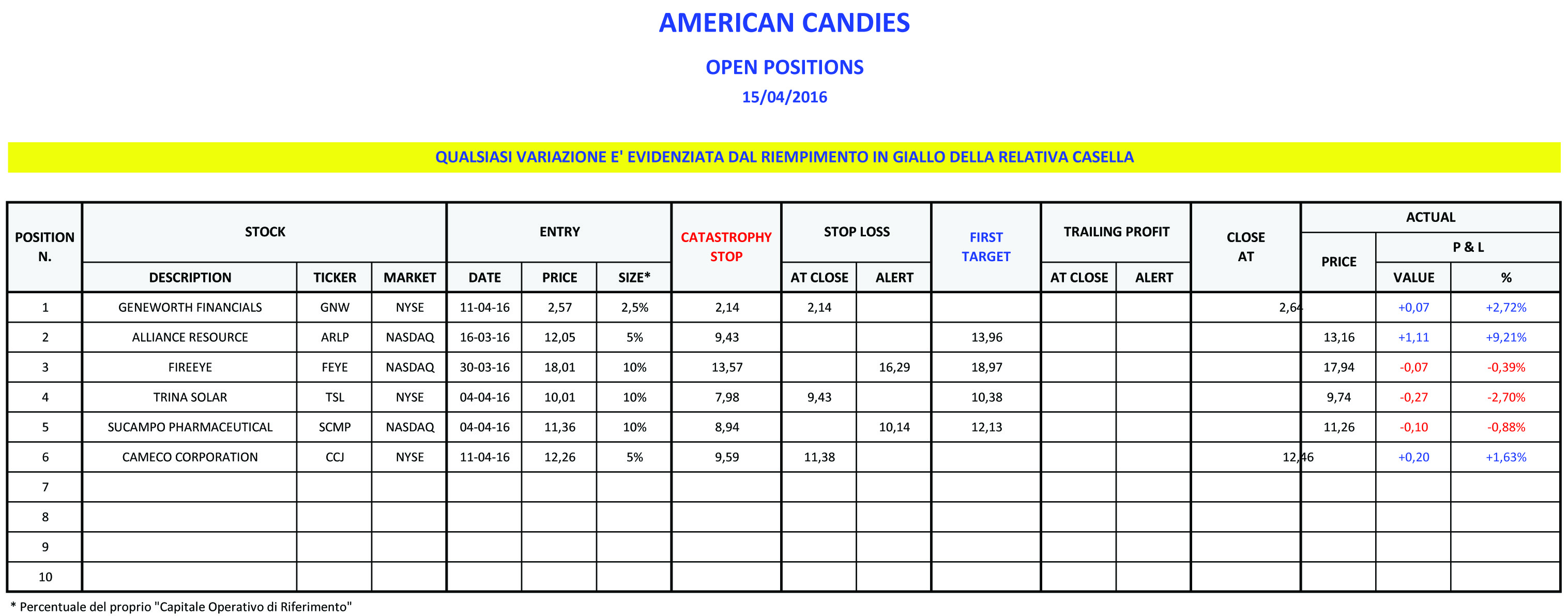 La situazione attuale del PORTAFOGLIO è di un’esposizione totale del 42.5% del “capitale operativo di riferimento” con 6 posizioni come illustrato nel seguente report riepilogativo delle posizioni attualmente aperte con i relativi livelli operativi