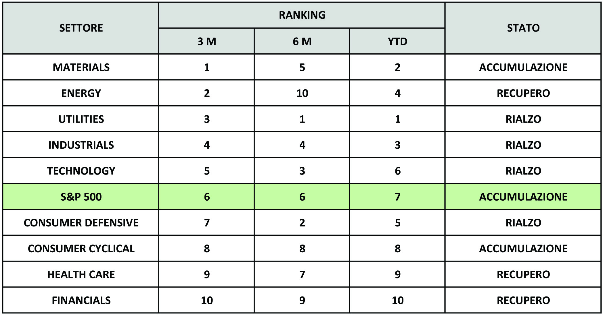 â–º Continua debolezza dei settori “Consumer Cyclicals”, “Financials” ed “Health Care” anche se quest’ultimo continua a mostrare segni di rafforzamento dovuti principalmente ad un ritrovato interesse nel suo sotto settore biomedico