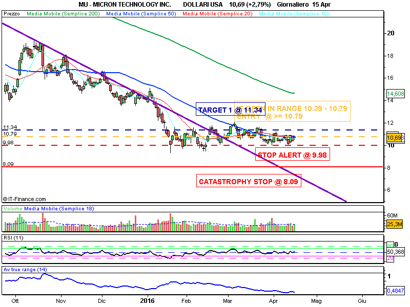 ENTRY : Se oggi 18 Aprile 2016 il titolo apre all’interno dell’ intervallo 10.39 – 10.79 imposta ordine condizionale per BUY STOP 10% “capitale operativo di riferimento” se il prezzo è >= 10.79