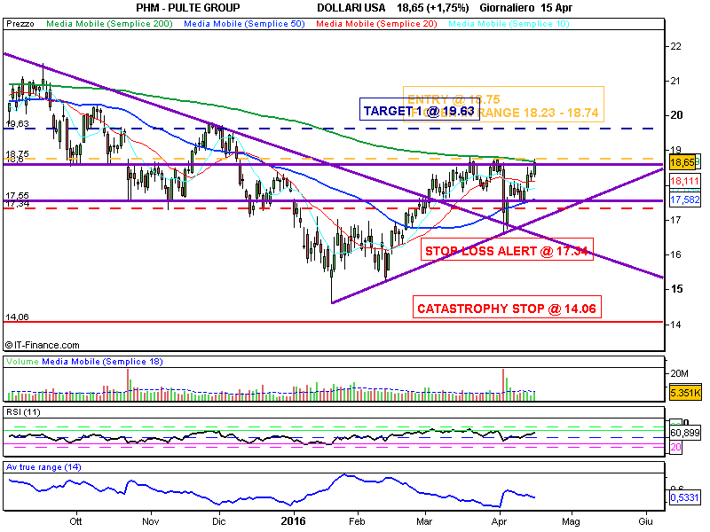 ENTRY : Se oggi 18 Aprile 2016 il titolo apre all’interno dell’ intervallo 18.23 – 18.74 imposta ordine condizionale per BUY STOP 5% “capitale operativo di riferimento” se il prezzo è >= 18.75