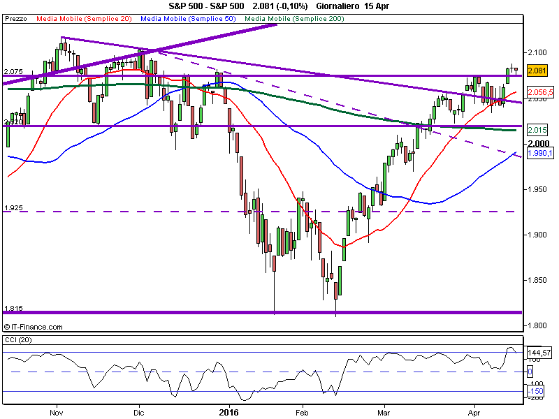 La scorsa settimana lo S&P500 ha attaccato, rotto e ritestato l’importante resistenza statica di 2075. Se nei prossimi giorni il trend continuerà al rialzo, la fase di accumulazione si esaurirà, trasformandosi in una vera fase di rialzo che sarà evidenziata dalla “Golden Cross” (incrocio al rialzo della SMA50 con la SMA200). Nonostante il buon sviluppo della situazione tecnica, il trend rimane, nel breve periodo rialzista e nell’intermedio ribassista, confermando uno scenario ancora incerto. Vedremo nelle prossime settimane se l’indice sarà capace di sferrare un attacco ai massimi di Novembre e della scorsa estate.
