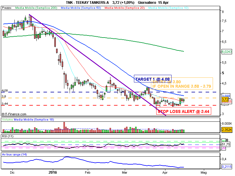 ENTRY : Se oggi 18 Aprile 2016 il titolo apre all’interno dell’ intervallo 3.58 – 3.79 imposta ordine condizionale per BUY STOP 5% “capitale operativo di riferimento” se il prezzo è >= 3.80