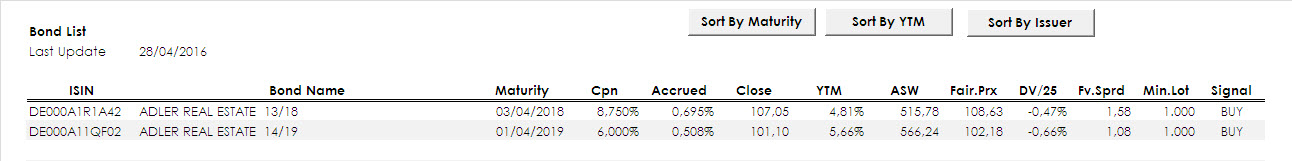 Si tratta di Adler Real Estate, società immobiliare tedesca che ha tre bond quotati OTC e di cui due risultano sottovalutati secondo il modello ASW, come si vede in tabella.