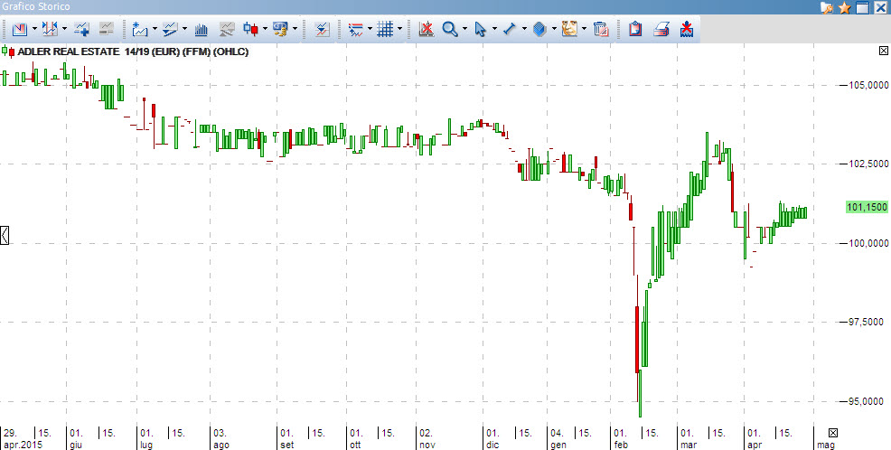 La prima, ADLER REAL ESTATE 13/18 (DE000A1R1A42), con scadenza 03/04/2018, offre una cedola dell’8,75% su base annua, per un YTM a scadenza (ai prezzi correnti) del 4,81%. Emissione pari a soli 35 Mln Euro, per cui illiquidissima.