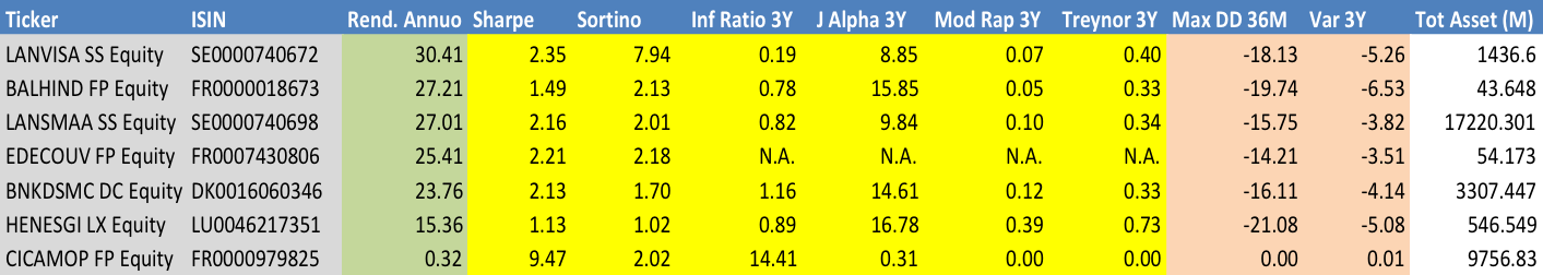 Volendoci ora concentrare su fondi più ‘aggressivi’ con un rendimento medio negli ultimi 3 superiore al 10%, troviamo che al primo posto in termini di Sharp Ratio si colloca LANVISA SS (ISIN: SE0000740672) fondo svedese condotto da Claes Murander, con un rendimento annuo del 30,40% e uno Sharp di 2,4.