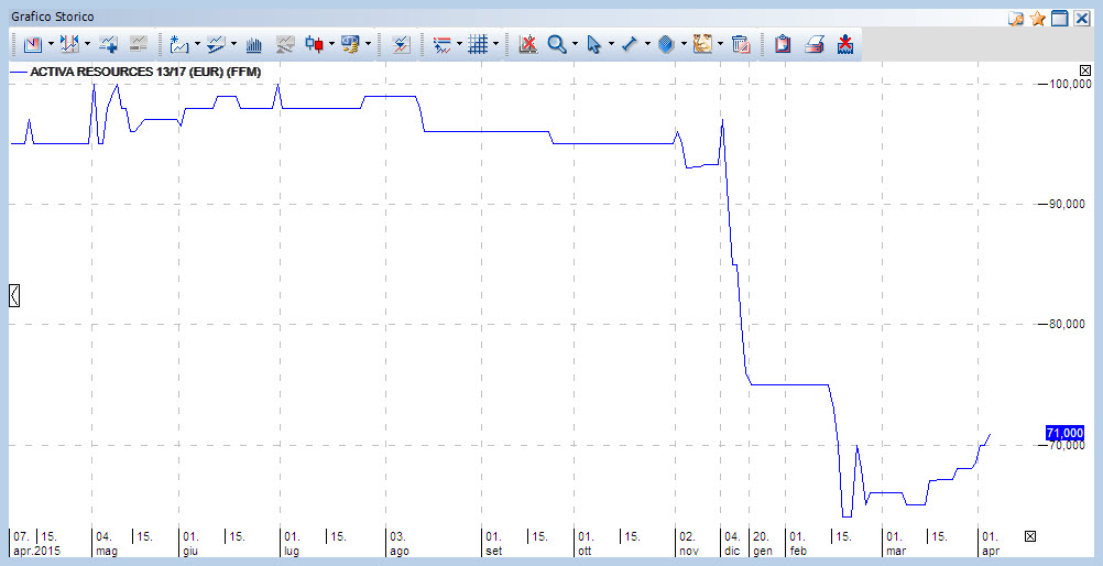 Il nostro piccolo corporate tedesco (Activa Resources 13/17, ISIN: DE000A1YCS50), segnalato pochi giorni fa in area 68, ha messo a segno un balzo di quasi il 4,5% in conto capitale (quota adesso 71,00) cui aggiungiamo un’omeopatica quota di rateo (8% su base annua) che male certo non fa.