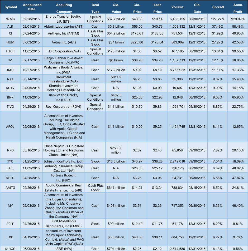 La tabella sottostante mostra le ‘top’ 20 acquisizioni in base all'ampiezza dello spread - maggiore possibile margine a fronte di un maggior rischio -.