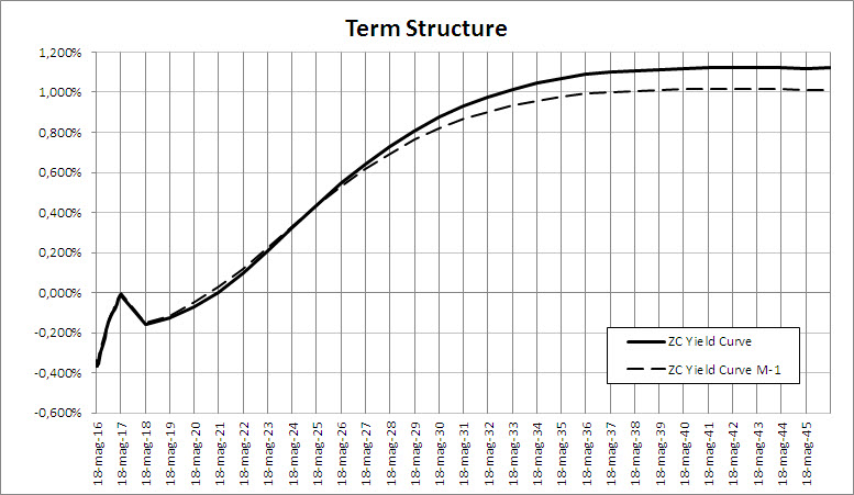 I tassi impliciti si muovono poco o nulla, e le differenze in bps rispetto a fine aprile sono ben poche, come si può vedere dal grafico della struttura a termine, riferita alla ZC Yield Curve area Euro.