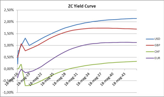 Ciò che più balza all’occhio è che anche sul tratto a breve, sia i bond in USD si quelli in GBP offrono rendimenti positivi e vicini all’1% su base annua, mentre in area Euro siamo letteralmente schiacciati a zero per scadenze fino al 2021. Peggio di noi solo la curva in CHF, ma qui è normale poiché la valuta elvetica rimane (a torto o a ragione) una valuta rifugio.