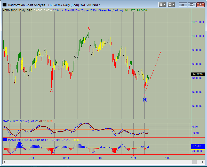 Terminata l'onda (4) il Dollar Index ha iniziato l'onda intermedia (5). Questa onda dovrebbe portare l'indice a nuovi massimi andando oltre il precedente massimo dello scorso 2 dicembre a 100,51. Una prima resistenza la troveremo in area 95,2. Per contro l'euro ha continuato a scendere avvalorando la tesi del triangolo.