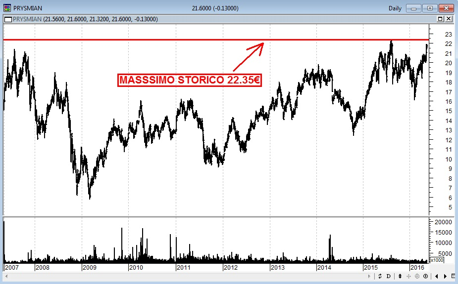 A livello tecnico ciò che si osserva è che il titolo Prysmian si trova in prossimità del massimo storico, e sembra prepararsi per un assalto rialzista: