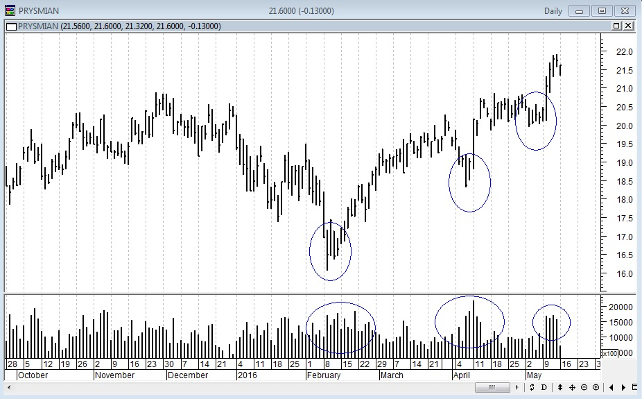 Focalizzando l’attenzione sui tempi più recenti si nota un interessante fenomeno in merito ai volumi negoziati, che sono sempre concentrati in brevi momenti di debolezza delle quotazioni, a indicare possibile accumulo. Volumi forti anche sul breakout del 10 maggio e nei giorni immediatamente seguenti.