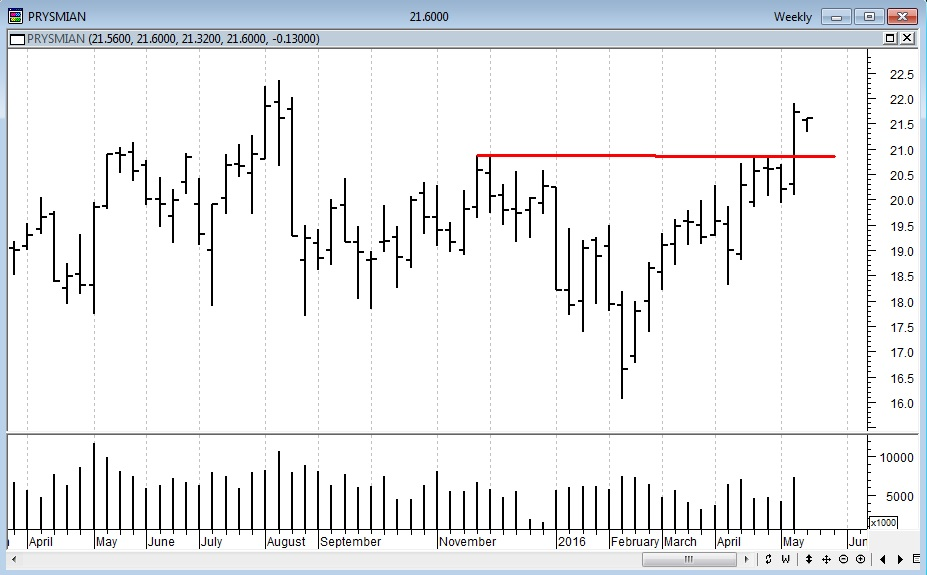 Figura 3: Prysmian barre settimanali, resistenza di DeMark violata al rialzo, target price indicativamente a 25.1€.