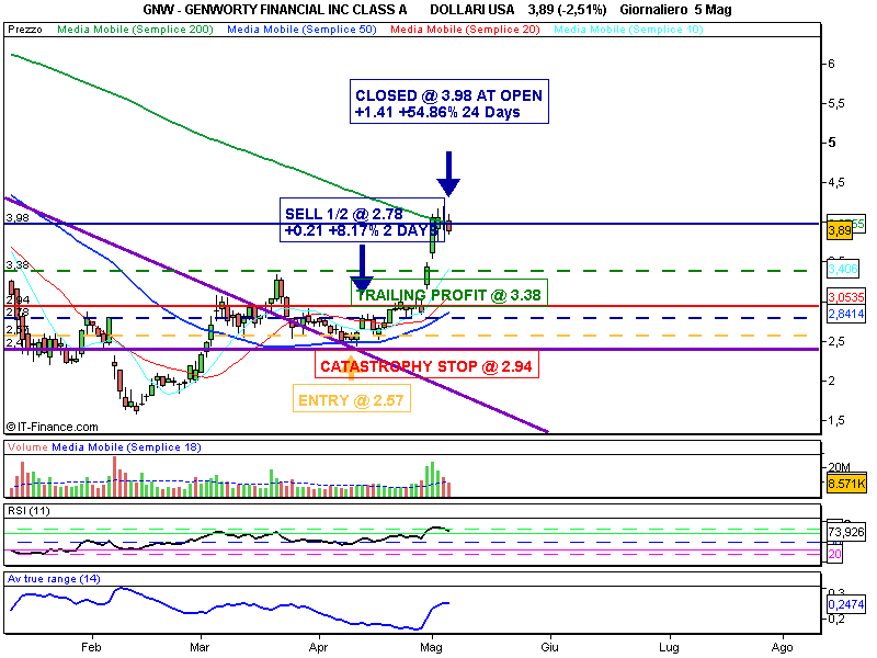 come da pianificazione, ieri all’apertura è stata chiusa la rimanente parte di Geneworth Financial con una performance del +54.86%.