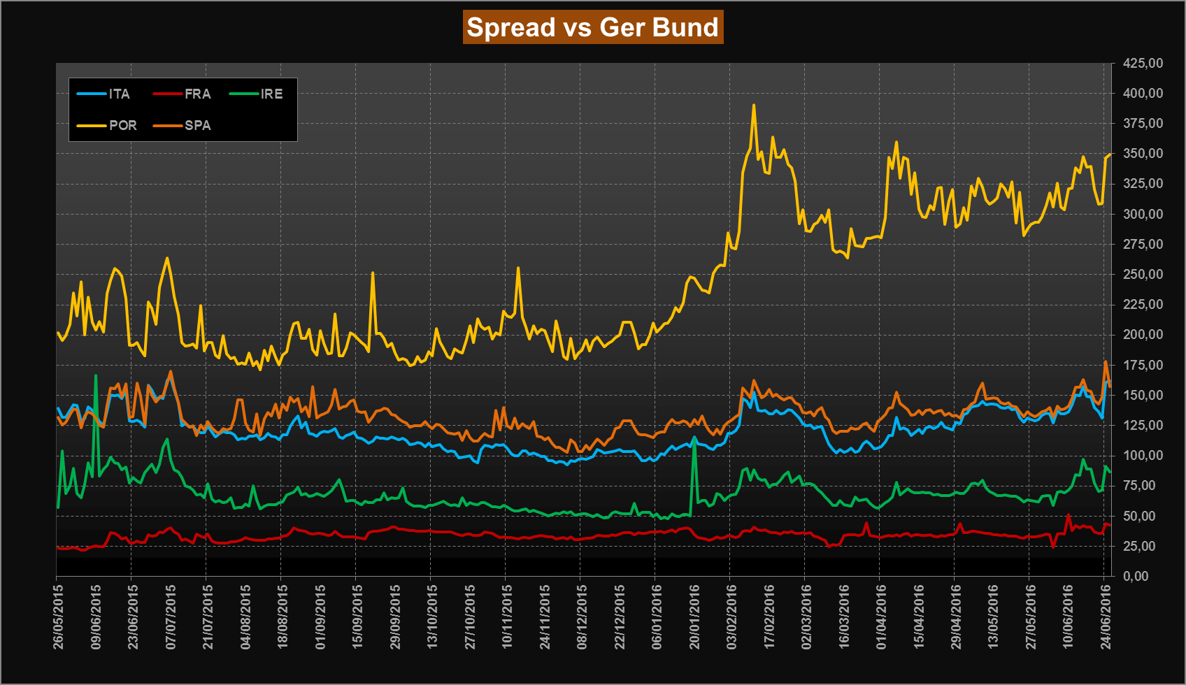 Pertanto, i Governativi hanno retto l’urto, con il Bund che ha svolto il suo compito di bene rifugio (ma siamo ancora sicuri che sto Bund sia così sicuro?) e i periferici non hanno fibrillato più di tanto, come possiamo vedere anche dal grafico qui sotto che ci mostra i maggiori spread vs Bund.
