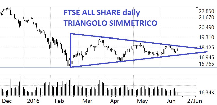 Non ne voglio fare una guerra di religione sui triangoli simmetrici, che dovrebbero essere pattern di continuazione (e quindi dovremmo ancora scendere ma con che obiettivo non si sa forse agli inferi) ma spesso in realtà sono pattern di rovesciamento (e quindi si dovrebbe salire). Sta di fatto che siamo nella bocca del triangolo, triangolo che tra poco ci sputerà fuori da una parte o dall’altra, in maniera improvvisa e inattesa e tutti faremo “oohh hai visto che drittone ?”.