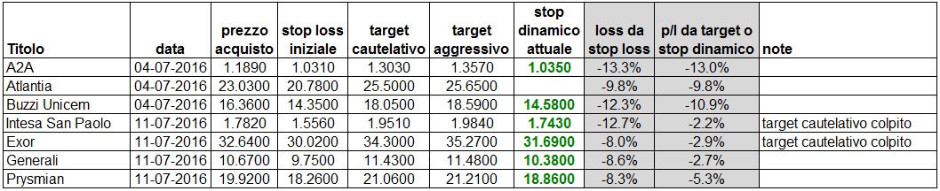 piccola correzione per il nostro mercato oggi, dopo aver messo a segno nuovi massimi di breve su diversi titoli. Si aggiornano i livelli di stop dinamico su quasi tutte le posizioni in essere. Di seguito il portafoglio aggiornato:
