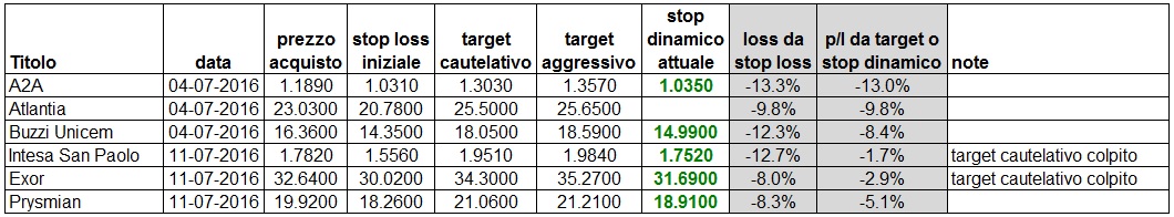 ancora una giornata positiva sul mercato italiano e nuovi massimi di breve su tanti titoli. Generali ha raggiunto entrambi i target e l'operazione è quindi chiusa. Bene anche Buzzi, stabili A2A e Atlantia, piccolo ritocco ai massimi precedenti per gli altri titoli. Portafoglio aggiornato con i nuovi livelli di stop dinamico:
