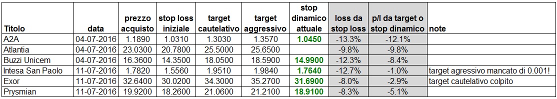 il portafoglio blue chips sta andando abbastanza bene. Intesa San Paolo ha mancato (per ora) il target aggressivo di un solo millesimo. Lo stop dinamico si alza quasi alla parità ora. Si alza un po' anche lo stop dinamico su A2A, invariati tutti gli altri. Aggiornamento portafoglio: