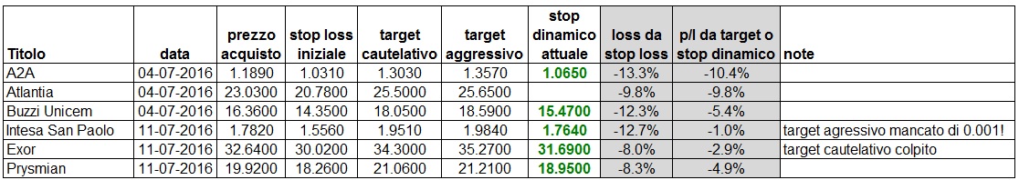 facciamo il punto sul portafoglio blue chips, al termine di una settimana veramente flemmatica per il nostro mercato. Buzzi sembra voler accelerare al rialzo, segna un nuovo massimo di breve e si alza così ancora un po' lo stop dinamico, che ora si trova a meno della metà rispetto al valore iniziale.